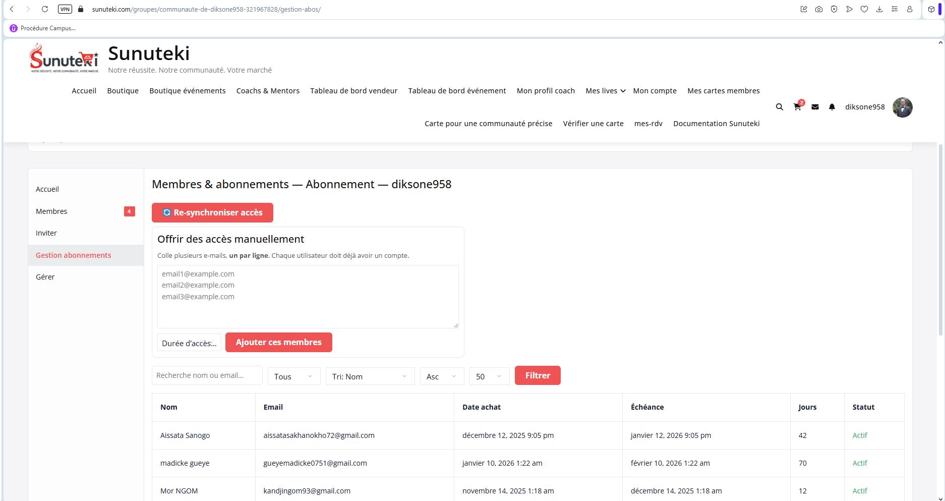 Tableau avec : nom, email, date d’achat, échéance, statut, jours restants.
